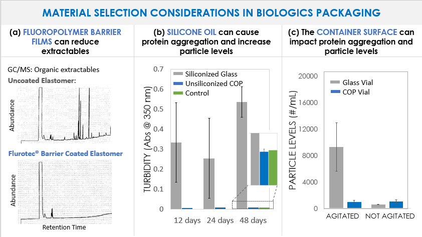 Figure 1 shows several example impacts that material selection can have on attributes such as extractables and protein aggregation. In Fig. 1a, gas chromatograms of an n-heptane extraction solvent that has come into contact with an uncoated elastomeric closure (top) versus a fluoropolymer film coated elastomer (bottom) show numerous organic extractables originating from the rubber which can be blocked by the presence of the barrier film. Some biologics, such as Orencia® as seen in Fig. 1b, are prone to aggregation in the presence of silicone oil (the gray bars show Orencia® aggregation in siliconized glass syringes). By eliminating silicone oil altogether, the aggregation can be mitigated (as shown by the blue bars indicating unsiliconized cyclic olefin polymer (COP) syringes). Finally, there is growing appreciation that the surface energy of the container can impact protein aggregation. In Fig. 1c, vials made of glass (which has a highly negatively charged surface) are associated with higher degrees of aggregation of the selected model protein (with agitation and in the absence of surfactant) as compared to COP vials (which have a low surface energy.). Selecting primary packaging materials with low surface energy (such as COP) and those materials which eliminate silicone oil may help drug manufacturers and compounders alike to meet USP<788> and USP<789> particle level requirements.