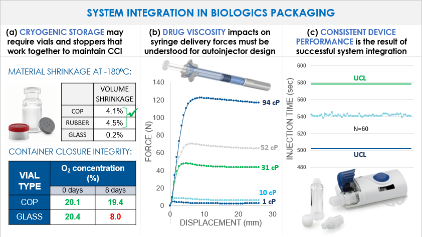 Figure 2 shows several examples of when full system integration needs to be considered in biologics packaging. Most gene and cell therapies will initially go to market packaged in vials which are cryogenically stored at either -80ºC or -180ºC until delivery to the patient. Under these harsh storage conditions, polymer materials such as halobutyl elastomers used in vial stoppers will experience volume shrinkage in accordance with the material's coefficient of thermal expansion (CTE). As seen in Fig. 4a, the volume shrinkage is similar for rubber stoppers and for cyclic olefin polymer vials (approximately 4.5% and 4.1% respectively in transition from room temperature to -180ºC.). Glass however shows little volume shrinkage. The mismatch in CTE's for rubber and glass presents a higher risk for container closure integrity breaches during cooling, storage, and warming as compared to the combination of rubber and COP. This has previously been observed experimentally through oxygen headspace analysis and is summarized in Fig. 2a. Even in the simplest case of vial containment, it is critical to understand how the components of a packaging system work together and it is helpful if a packaging supplier can provide data packages to evidence the performance of the integrated system.