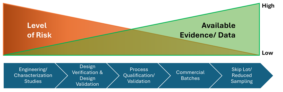 One’s appetite for risk is informed by data or evidence (or lack thereof), maturity, the complexity of the device constituent components and/or processes, and the potential harm to users, should something go wrong. As more data becomes available – through design verification testing, process qualification, etc. – the level of risk generally reduces (Figure 3). This data should be fed back into the control strategy in order to make informed decisions on the combination product CQAs, which will require testing on release of the finished product.