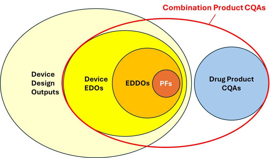 PFs are usually also identified as EDDOs and are a subset of the essential design outputs (EDOs) and a totality of the development effort. In some cases, there’s an overlap between device CQAs and drug CQAs. Some examples include sterility, sub-visible particulates, or delivered dose, which can be applicable to both the drug product (in its container) and the drug delivery device. Understanding where overlap exists highlights the importance of an end-to-end control strategy starting at the beginning of development.