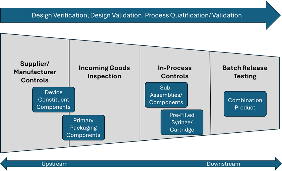 As with much of device and combination product development, a risk-based approach must be applied. Consistent risk management should be implemented from the beginning of development, as it not only helps to identify the combination product CQAs, but also drives the organization’s strategy for design verification (sample size, acceptance criteria, statistical tolerance intervals), process qualification, and controls (incoming goods per ISO 2859-1, for example, release testing, etc.).