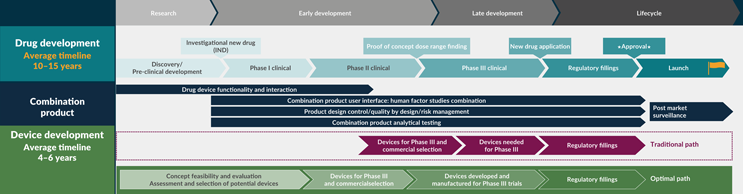 One of the significant challenges in developing combination products lies in the timing and coordination of device development. Historically, device development teams are often not consulted until after a therapeutic program has demonstrated success in a Phase 2B study (see Figure 1). This late involvement can put significant pressure on the device development schedule, making it a critical aspect of the overall project timeline.