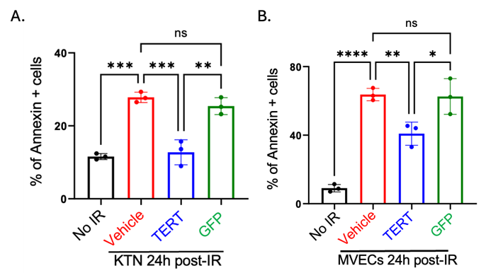 Figure 1. TERT mRNA treatment reduces apoptotic human keratinocytes and dermal microvascular endothelial cells. Annexin V-positive cells indicate apoptotic cells. (A) Quantitative analysis of annexin V-positive cells in indicated groups of human epidermal keratinocytes (KTN). (B) Quantitative analysis of annexin V-positive cells in indicated groups of human dermal microvascular endothelial cells (MVECs). Adapted from Li et al.1