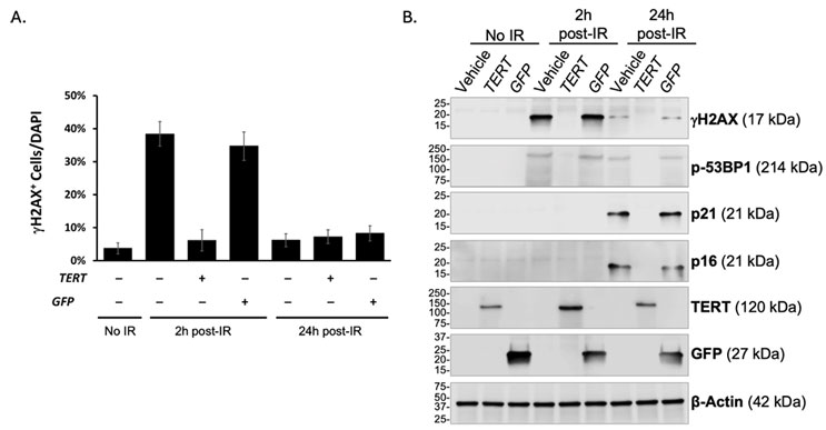 Figure 2. Ex vivo human skin pretreated with TERT mRNA reduced radiation-induced γH2A.X signal and senescence markers. (A) Percentage of cells stained positive for γH2A.X in indicated conditions. (B) Western blot analyses of whole cell lysates collected from non-treated skin samples (lanes 1-3), skin samples harvested 2 hours post irradiation (lanes 4-6), or skin samples harvested 24 hours post irradiation (lanes 7-9). Adapted from Li et al. 1