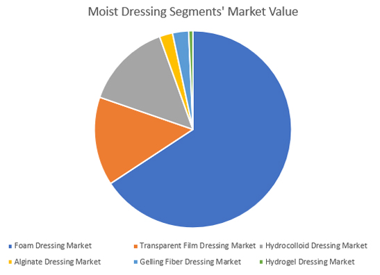 Growth in the moist dressing market is largely driven by the aging population due to its applications in providing protection of fragile skin from moisture, friction, and pressure. Moist dressings are made up of numerous sub-segments, the most prominent one being foam dressings. Foam dressings are commonly used because they are highly absorbent and protective, they facilitate a moist wound environment, and they do not require frequent changes due to their properties.3 Foam dressings are both the largest and fastest-growing sub-segment within the moist dressing segment.1