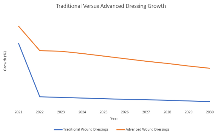 Because of the benefits provided by advanced wound dressings, there has been a shift away from using traditional wound dressings, such as gauze, tape, bandages, and cotton, in situations where they would have been used for more complex wounds. Gauze and cotton can still be an effective method to treat acute wounds and, due to their lower price points, traditional dressings will not be replaced. However, for chronic wounds, traditional dressings cannot be as efficient as advanced dressings and have disadvantages such as poor barrier function and poor hemostasis. Additionally, traditional dressings are dry and can sometimes be painful, especially during removal, and frequent removals are required when using gauze dressings. Advanced wound dressings include foams, films, sponges, fibers, and hydrogels, all of which solve the problems with using traditional dressings.2