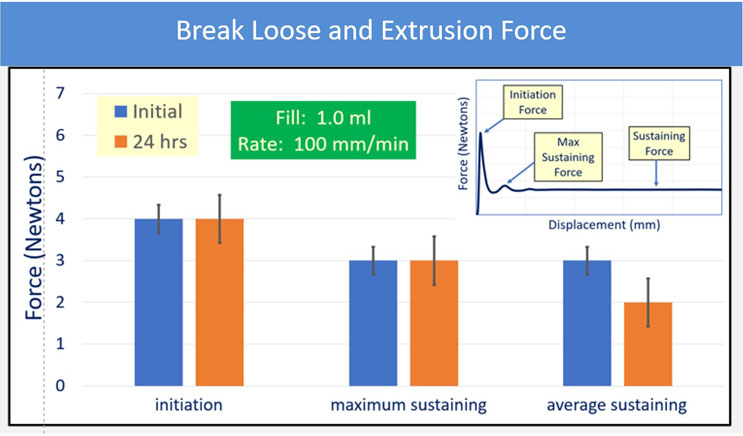 The syringes tested for BLE post -50°C storage showed similar appearances. Overall, the evaluation of initiation and sustaining forces at 100 mm/min demonstrated no change in performance for any PFS resultant from freezer placement and thaw. Syringes with FluroTec laminated plungers were tested for break-loose and extrusion forces post -50°C storage glass syringes showed typical BLE values and performance at both sizes. The 1 mL polymer syringe showed a slightly higher break-loose, maximum extrusion and average extrusion than the glass syringes, but is still comparable to the glass performance. Example data are shown in Figure 3.