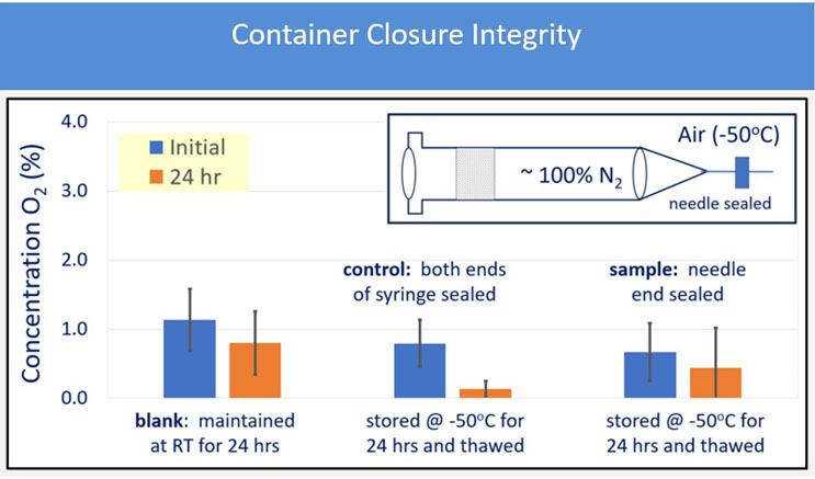 CCI testing showed no gross gas exchange during the -40°C and -50°C freezing. Gross exchange is defined as a 2% or higher increase in oxygen concentration, which was experimentally determined. The selected polymer system did show a > 2% exchange when stored at room temperature in 3 out of the 10 syringes tested, which could be expected based on the inherent permeability of cyclic olefin co-polymers. When stored at cold temperatures, the exchange rates were significantly less, and no values were seen > 2%. These results indicate that the assemblies of the 1 mL long FluroTec plungers in a standard 1 mL long glass syringe and in a standard 1 mL polymer-based syringe, and the 1-3 mL FluroTec plungers in a standard 2.25 mL glass syringe exhibited promising behavior that warrant further study for container closure at low temperatures. The evaluation of CCI demonstrated no breach of any PFS. Example data are shown in Figure 2; the oxygen concentration was measured before, and after, freezer placement and thaw. No increase in oxygen concentration was observed. A breach would result in an oxygen concentration the same as freezer air (i.e., 21%), especially since upon the decrease in pressure within PFS upon freezer placement would promote air ingress.