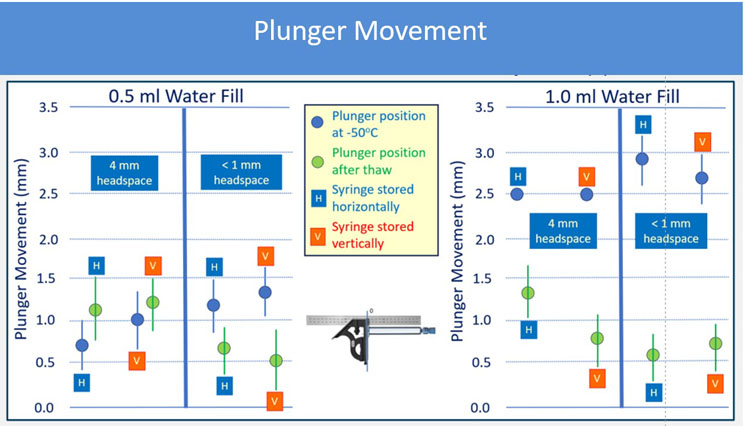 Experimental evaluation was made of water-filled PFSs comprising ISO-standard 1 ml long and 2.25 ml glass staked-needle syringes with FluroTec plungers. Storage conditions were at -50oC (passive freezing in mechanical freezer, vis-à-vis controlled-rate freezing) for > 24 hours followed by bench-top thaw for > 1 hour. In this experiment, the plunger position is recorded before freezer placement, immediately after removal, and after thaw. Emphasis is on movement past the sterile barrier as defined by the sealing ribs.